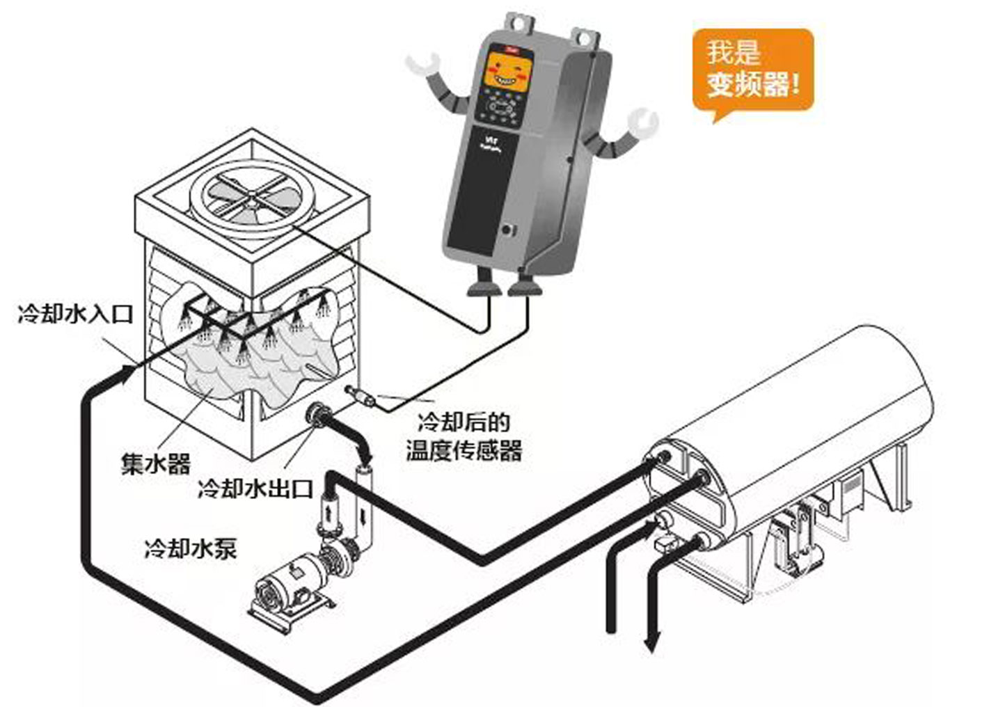 加入變頻器后,操作十分簡單,設定制冷機組所需要的冷卻水溫度、溫度傳感器必要參數,變頻器便可對冷卻塔的散熱風機轉速進行實時的動態(tài)控制啦~