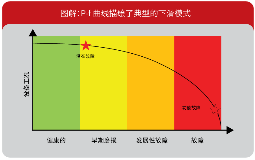 基于工況的維護(hù)是利用獲取的數(shù)據(jù)監(jiān)測(cè)現(xiàn)有設(shè)備的健康狀況。為此,要選擇關(guān)鍵參數(shù)作為識(shí)別發(fā)展性故障的指標(biāo)。設(shè)備狀況通常會(huì)隨著時(shí)間的推移而下滑。P-f 曲線(xiàn)表明了典型的下滑模式。設(shè)備不能執(zhí)行預(yù)期的功能時(shí),就會(huì)發(fā)生功能故障。基于工況的維護(hù)就是要在故障真正發(fā)生之前檢測(cè)潛在的故障。規(guī)劃維護(hù)措施的優(yōu)勢(shì)如下: