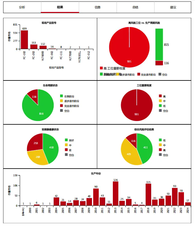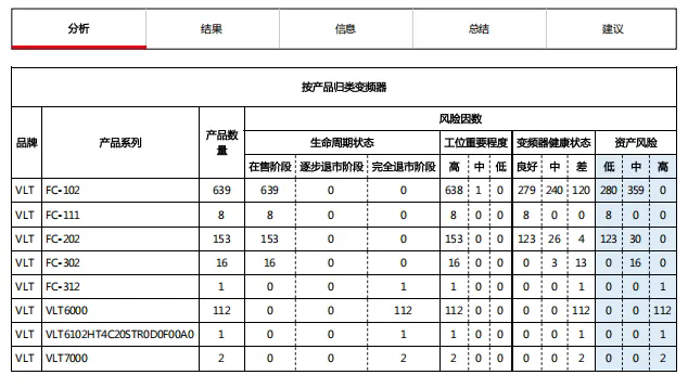 丹佛斯工程師帶領(lǐng)團(tuán)隊(duì),現(xiàn)場(chǎng)推進(jìn)評(píng)估工作。依據(jù)現(xiàn)場(chǎng)評(píng)估所獲取的數(shù)據(jù)信息可知,當(dāng)前該熱力公司在用的變頻器以丹佛斯FC102和FC202機(jī)型為主,有少量FC302和FC111機(jī)型,其中112臺(tái)已退市的VLT6000機(jī)型仍在使用,445臺(tái)變頻器已使用超過(guò)10年,253臺(tái)變頻器健康狀態(tài)較差。此次現(xiàn)場(chǎng)評(píng)估工作從變頻器健康狀態(tài)、生命周期、工位重要程度三個(gè)維度進(jìn)行了分析,幫助客戶梳理變頻器臺(tái)賬,排查故障,為后續(xù)的設(shè)備維保改造與預(yù)算制定計(jì)劃提供了依據(jù)。