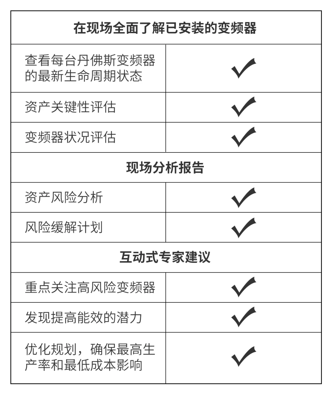 為了解決變頻器資產(chǎn)管理不足等問(wèn)題,最大限度地減少供暖設(shè)備意外成本和停機(jī)時(shí)間,丹佛斯為該供熱公司提供了DrivePro® Site Assessment服務(wù),針對(duì)該供熱公司的所有變頻器進(jìn)行全面現(xiàn)場(chǎng)調(diào)查和風(fēng)險(xiǎn)分析并提供一份關(guān)于變頻器資產(chǎn)狀況、危急程度和生命周期狀態(tài)的詳細(xì)報(bào)告,優(yōu)化維護(hù)策略。