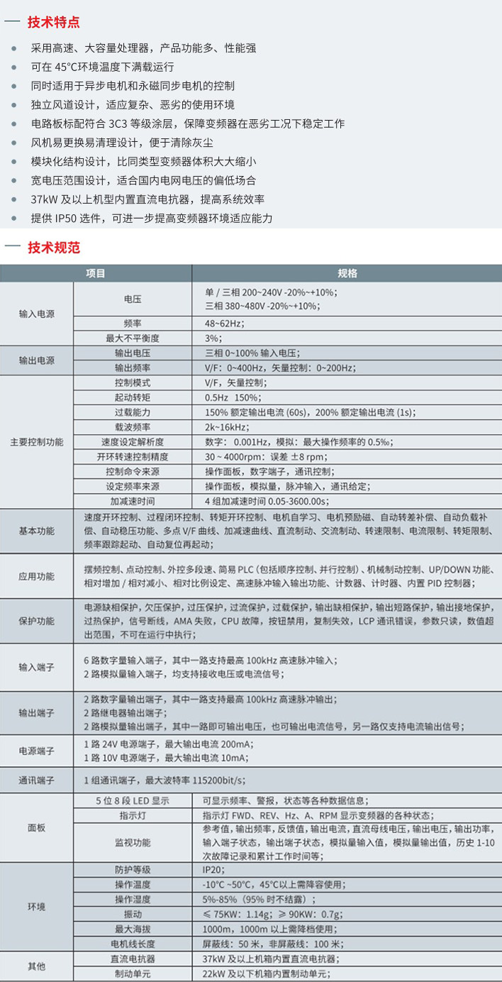 37kW及以上內(nèi)置直流電抗器,提高系統(tǒng)效率