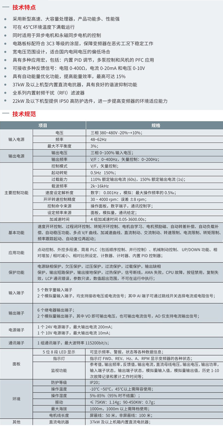 22kW及以下機型提供IP50高防護選件,進一步提高變頻器的環(huán)境適應(yīng)能力