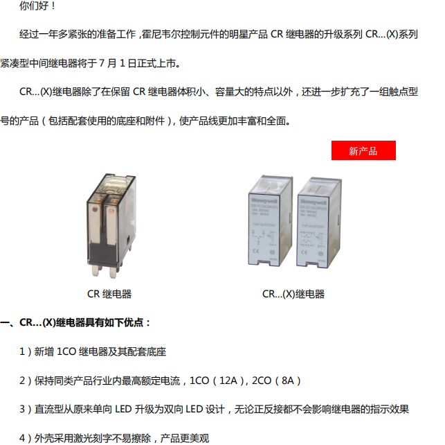 經(jīng)過一年多緊張的準(zhǔn)備工作,霍尼韋爾控制元件的明星產(chǎn)品CR繼電器的升級(jí)系列CR...(X)系列緊湊型中間繼電器將于7月1日正式上市。