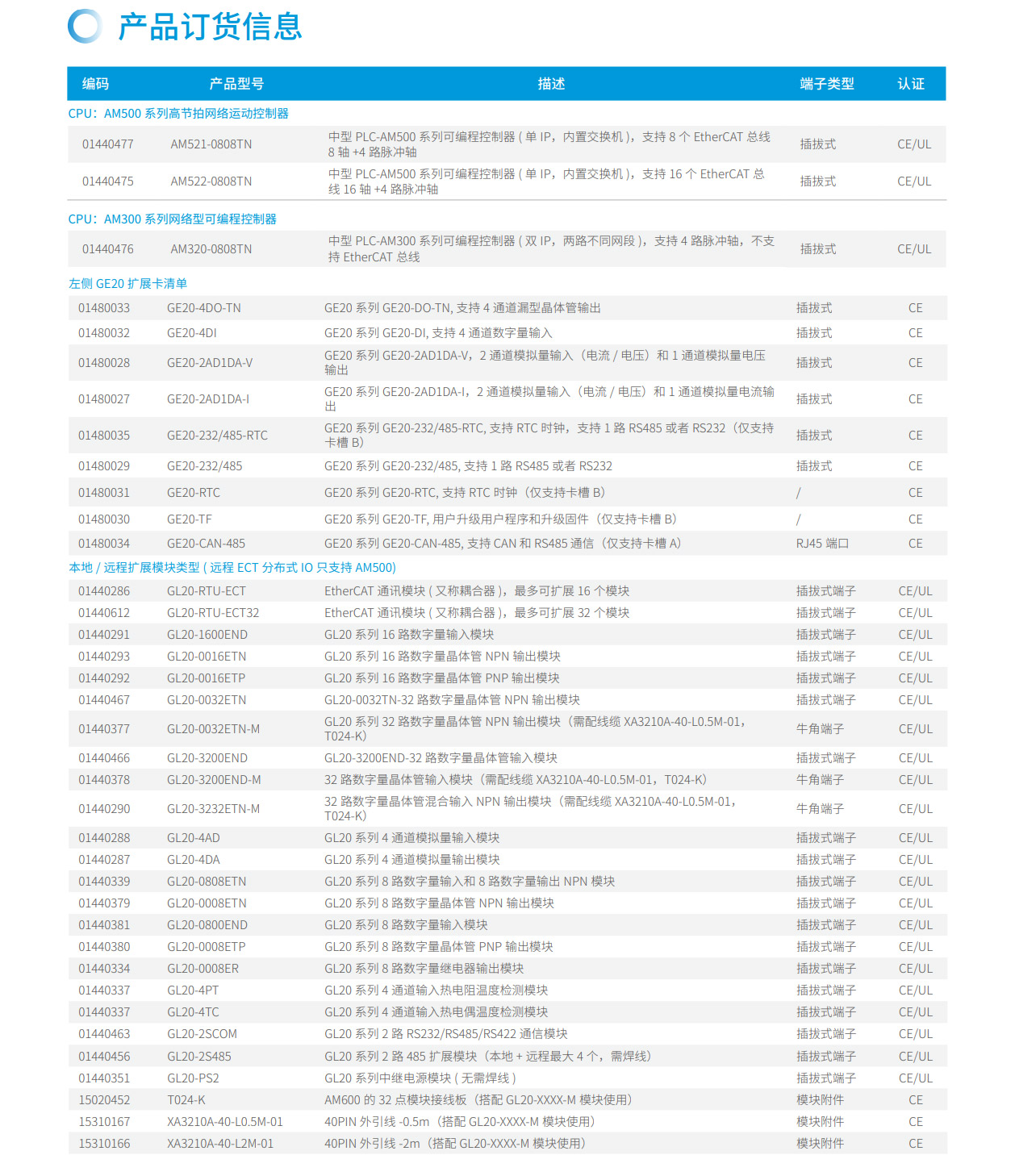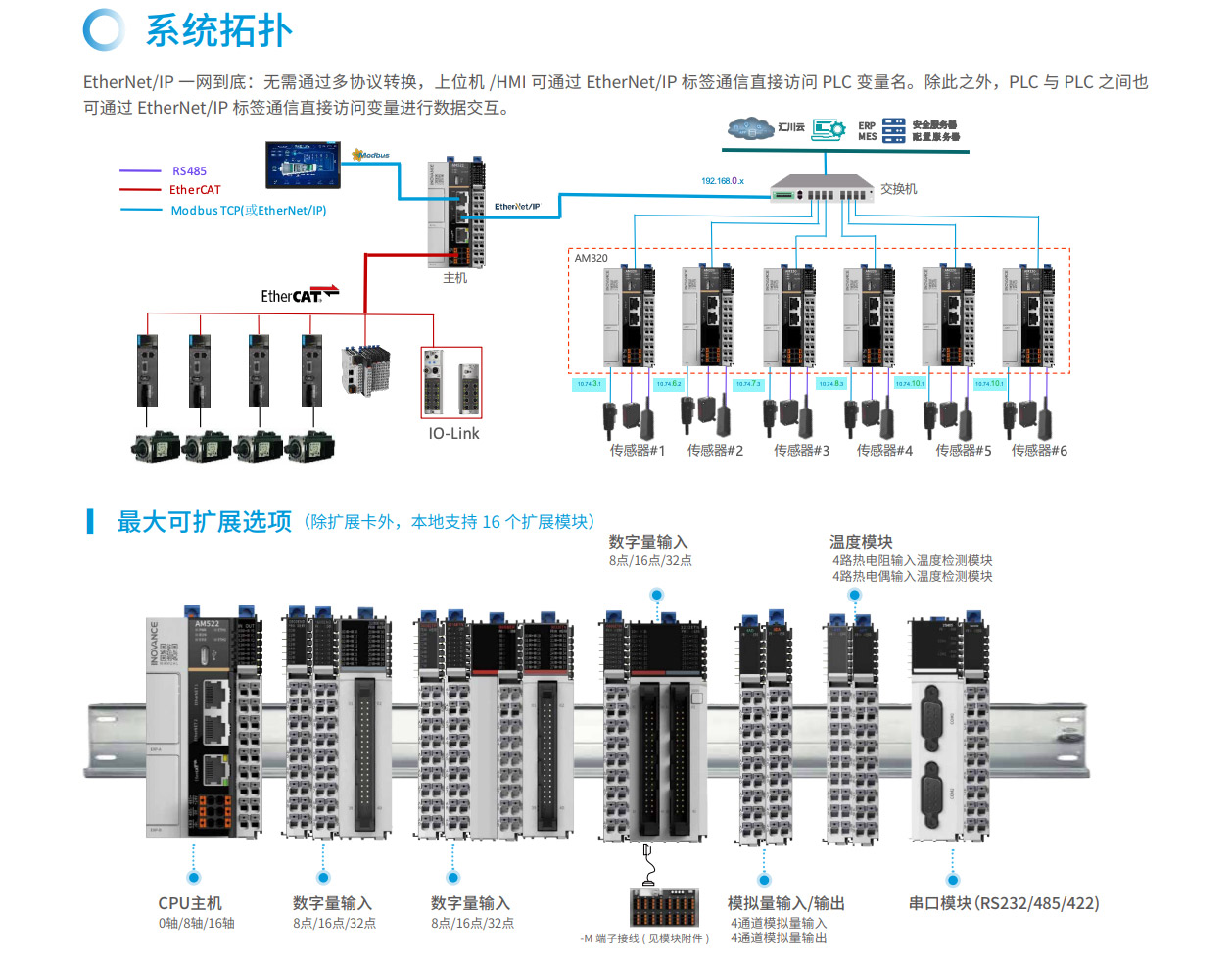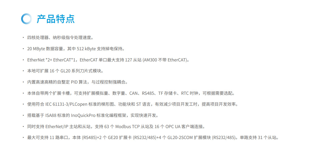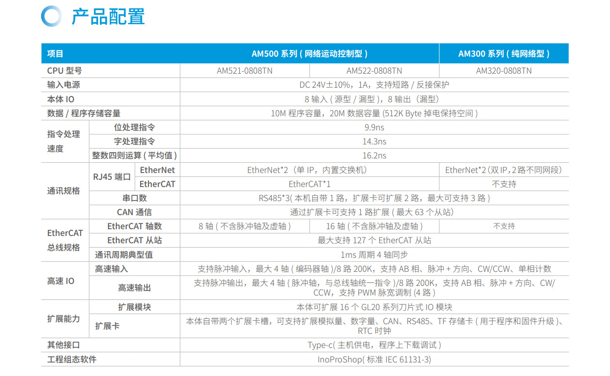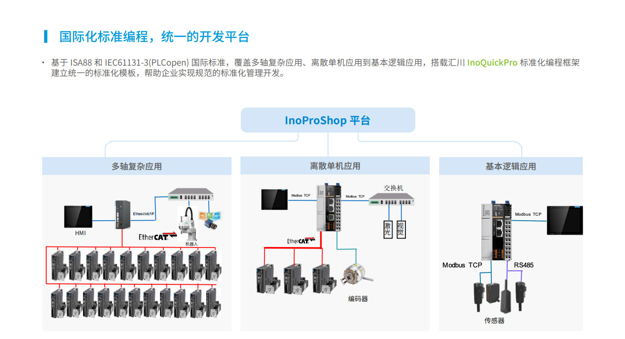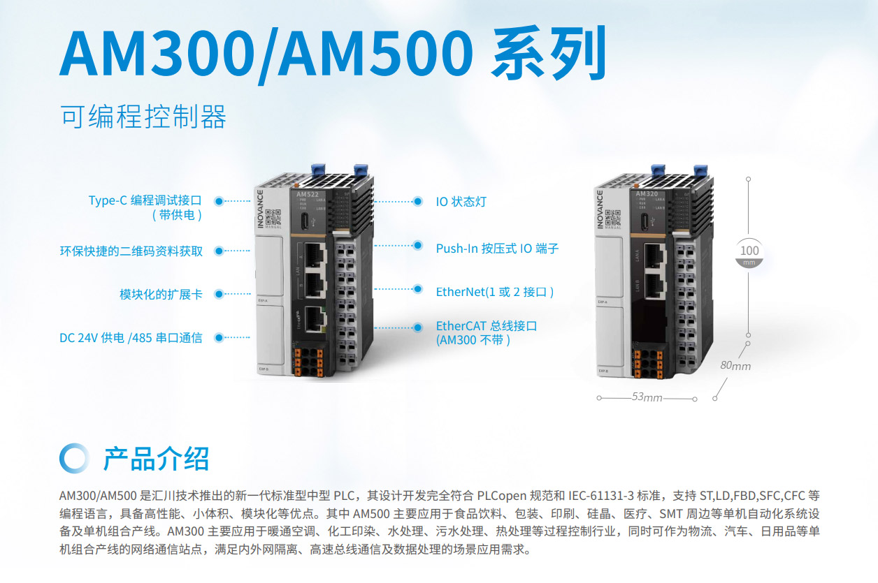 AM500系列是匯川技術(shù)推出的新一代標(biāo)準(zhǔn)型中型PLC,其設(shè)計開發(fā)完全符合PLCopen規(guī)范和IEC-61131-3標(biāo)準(zhǔn),支持ST,LD,SFC,CFC等編程語言,以其小巧的CPU體積、模塊化靈活組合及高節(jié)拍生產(chǎn)特性可適應(yīng)更多的應(yīng)用場景。支持EtherCAT、EtherNet/IP、OPC UA、Modbus TCP(支持兩路同一網(wǎng)段的IP地址)、TCP/IP、RS485(最大可擴(kuò)展至3路)、CAN總線等全球標(biāo)準(zhǔn)的工業(yè)網(wǎng)絡(luò)。主要應(yīng)用于食品飲料、包裝、印刷、硅晶、醫(yī)療、SMT周邊等單機(jī)自動化設(shè)備及單機(jī)組合產(chǎn)線,滿足生產(chǎn)效率及控制精度提升場景需求。其開發(fā)編程平臺InoProShop覆蓋從多軸復(fù)雜應(yīng)用、離散單機(jī)應(yīng)用到基本邏輯應(yīng)用,可搭載匯川技術(shù)基于ISA88標(biāo)準(zhǔn)開發(fā)的InoQuickPro標(biāo)準(zhǔn)化編程模板框架,實現(xiàn)規(guī)范的標(biāo)準(zhǔn)化管理開發(fā),降低人才培訓(xùn)成本。