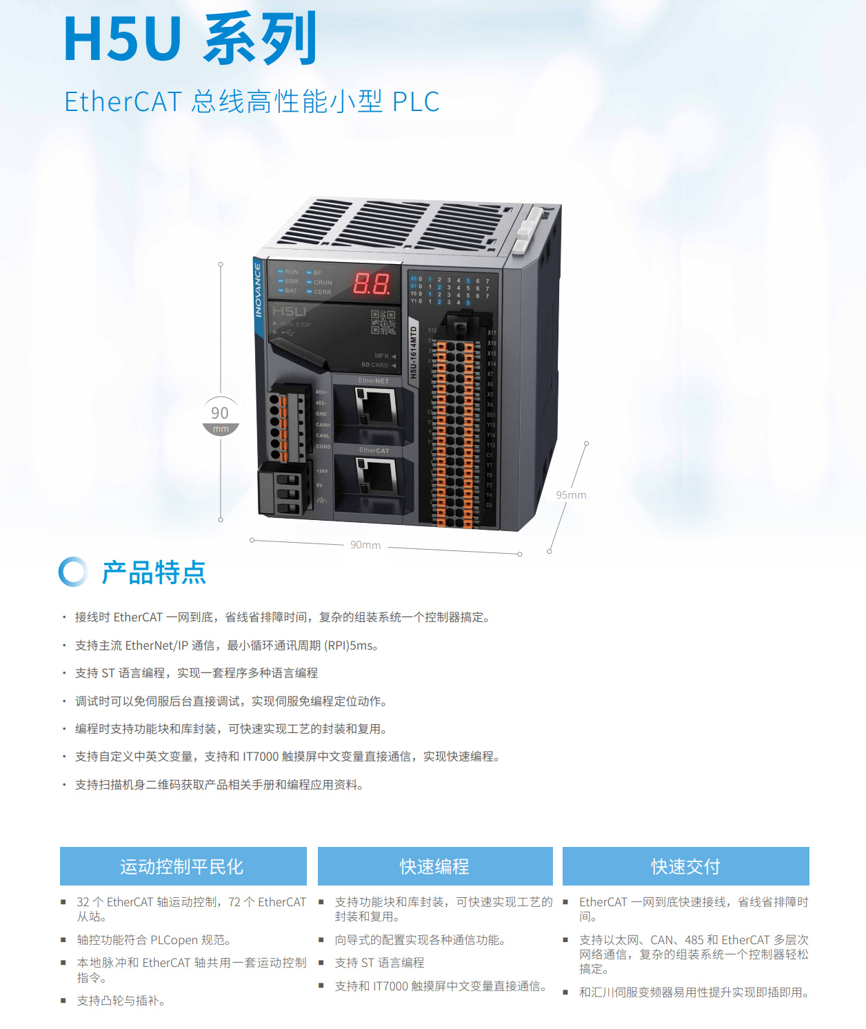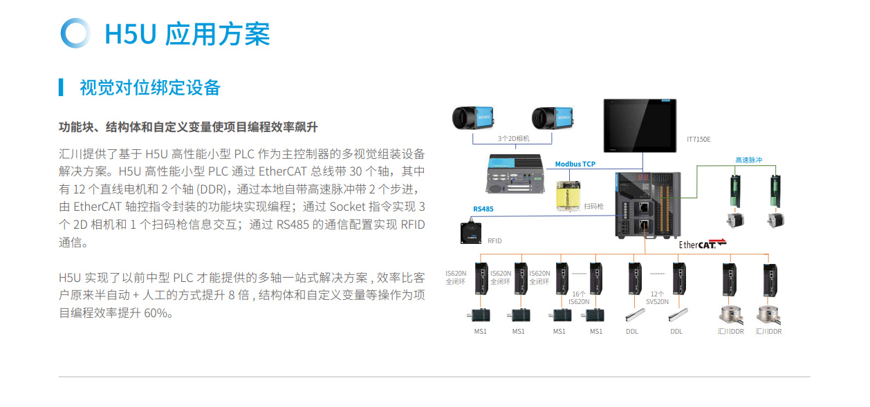 匯川技術(shù)推出首個(gè)應(yīng)用EtherCAT 總線的小型PLC H5U,讓線體設(shè)備飛速運(yùn)轉(zhuǎn)。隨著終端消費(fèi)日趨升級,生產(chǎn)制造面臨巨大的壓力,而H5U 能夠簡化布線量、加快編程調(diào)試時(shí)間、滿足帶軸能力的要求以及嚴(yán)苛的成本控制需求,從容應(yīng)對嚴(yán)峻的挑戰(zhàn),是將EtherCAT 總線應(yīng)用到小型PLC 的先鋒之作。