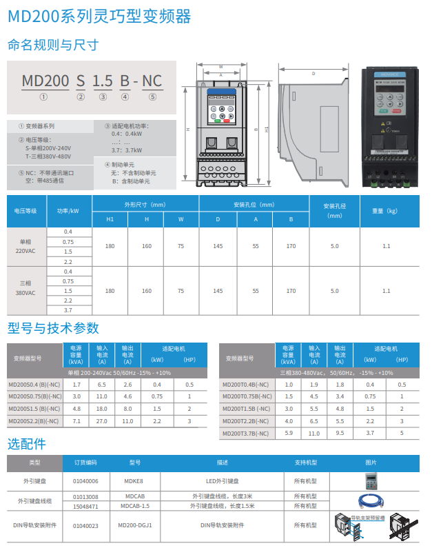 MD200系列緊湊型變頻器是匯川技術(shù)基于小功率、小體積、低成本的市場需求,針對性推出的單相220 VAC 和三相380 VAC 迷你變頻器。MD200 采用V/F 控制方式、無速度傳感器矢量控制方式(SVC),具有高功率密度、高EMC 規(guī)格設(shè)計、高防護性能等顯著優(yōu)勢。